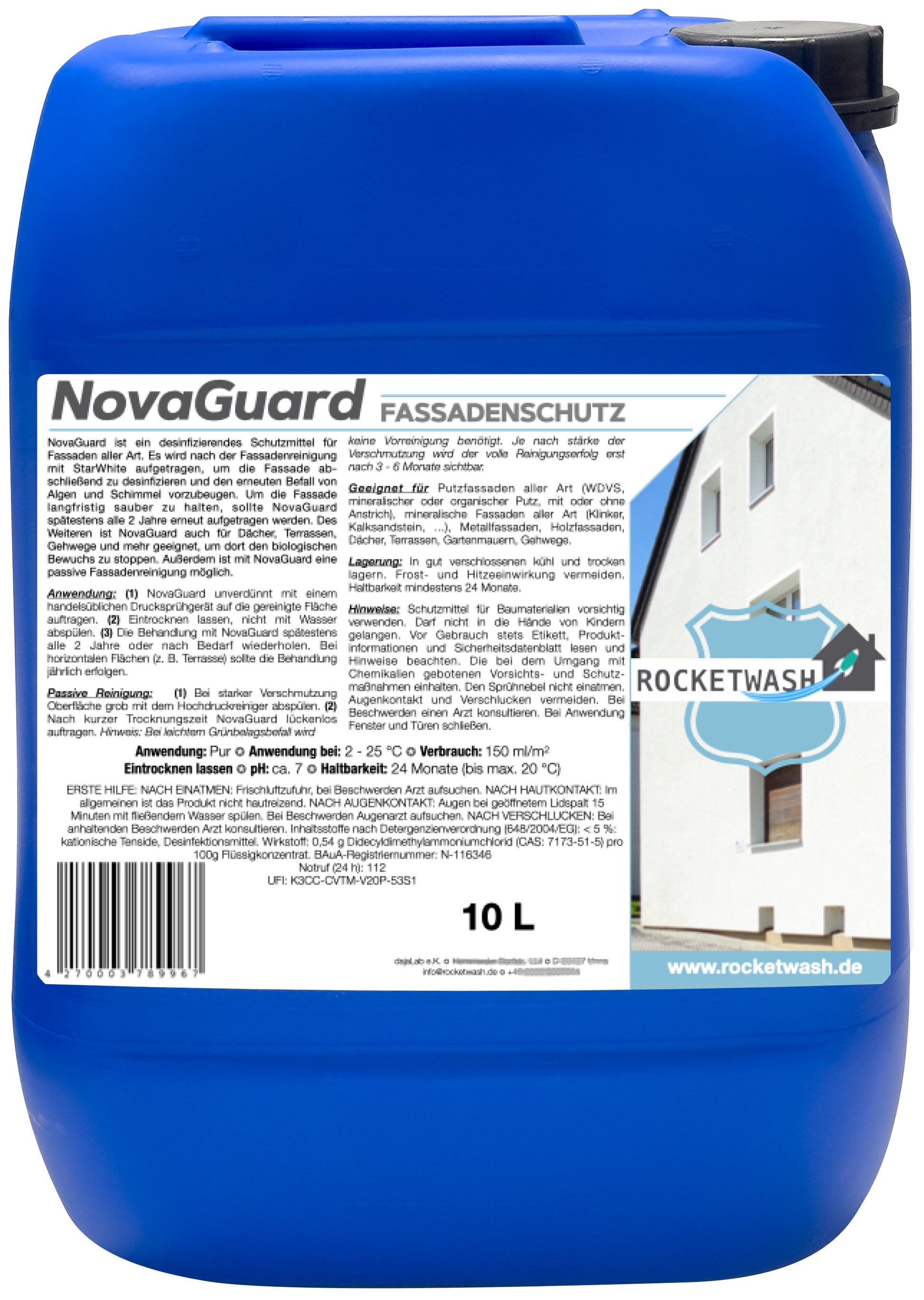 NovaGuard ist ein äußerst wirksamer anwendungsfertiger Fassadenschutz. Es schützt Putzfassaden und angestrichene Fassaden aller Art vor Algen und Pilzbewuchs. Üblicherweise wird es nach der Fassadenreinigung mit StarWhite aufgetragen, um die Fassade abschließend zu desinfizieren. Damit wird verhindert, dass sich neue Verfärbungen an der Fassade bilden können. Um die Fassade langfristig sauber zu halten, sollte NovaGuard alle ein bis zwei Jahre erneut aufgetragen werden.